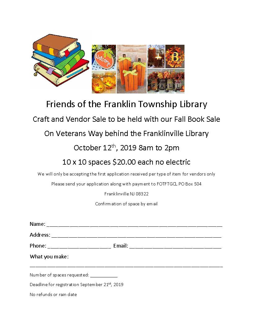 Craft and vendor spaces will be located outside during the book sale, which is held indoors, with a door connecting directly to the vendor area. If you'd like to be part of it, Library Book Sale Vendor Application. Deadline for vendor/crafter registration is Saturday, September 21.